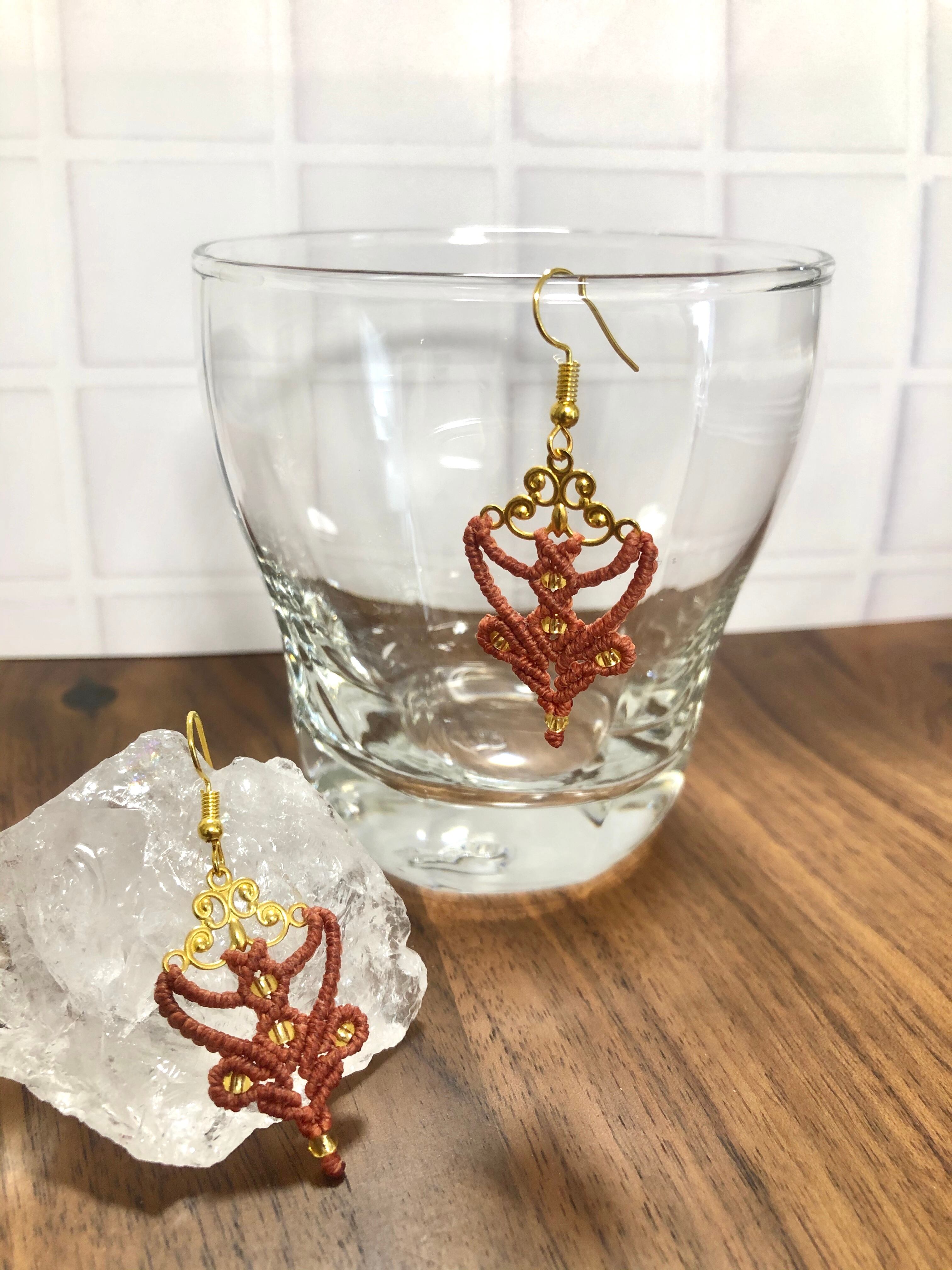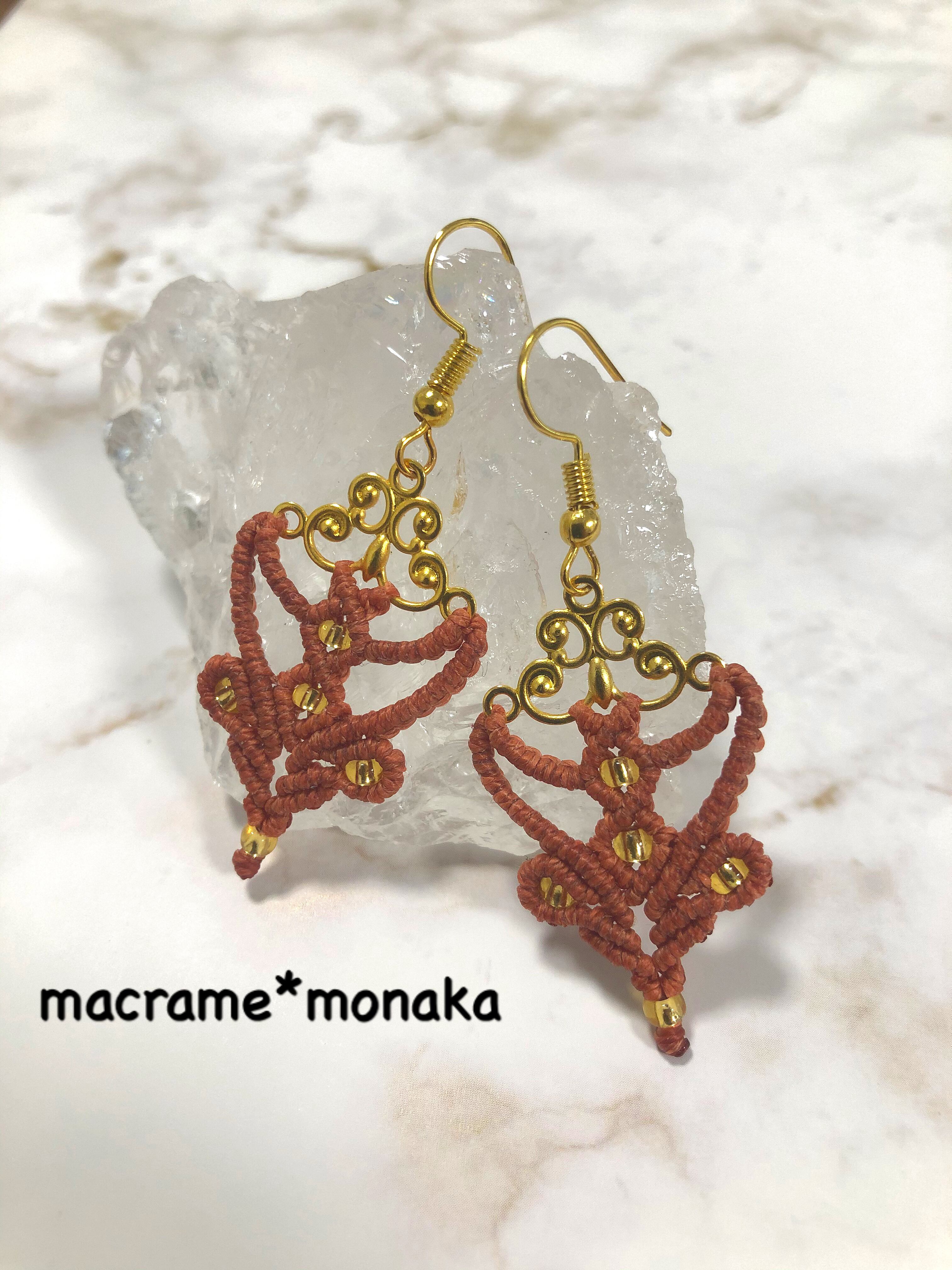 ゴールドパーツ、ビーズ、0.75mmのワックスコードで作ったマクラメ編みのピアスです。