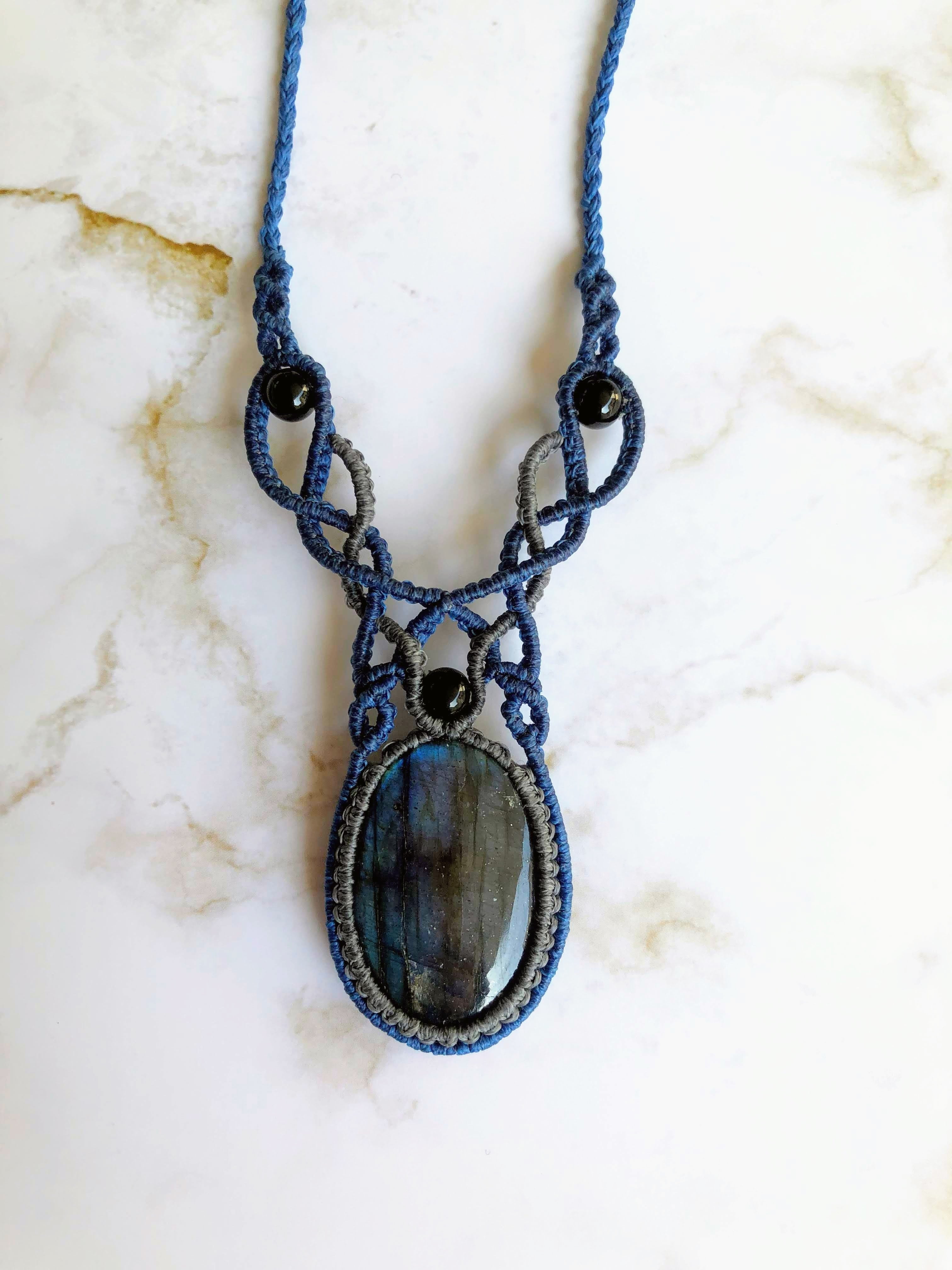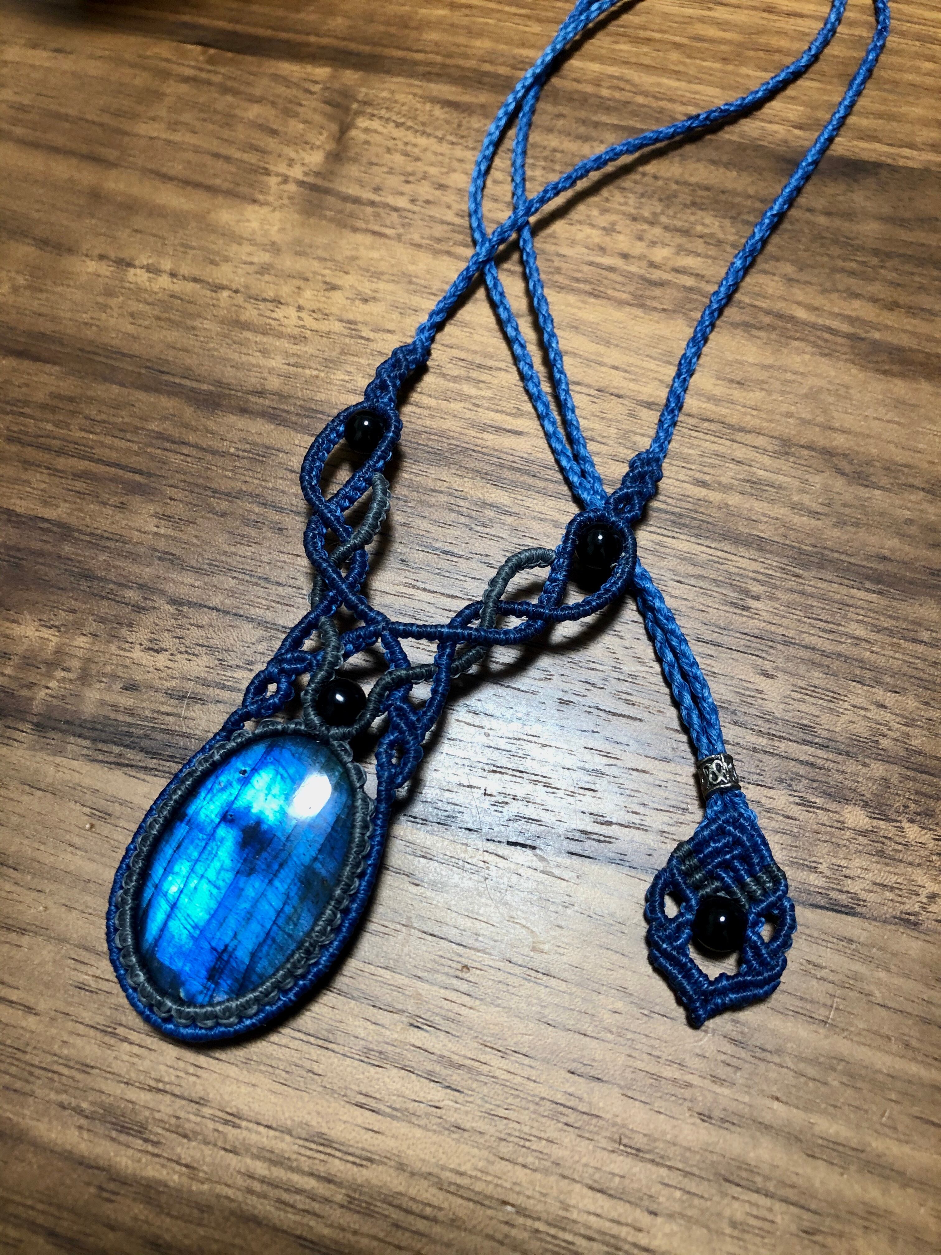 大きめのマダガスカル産ラブラドライトを2色のワックスコードで包み込みました。