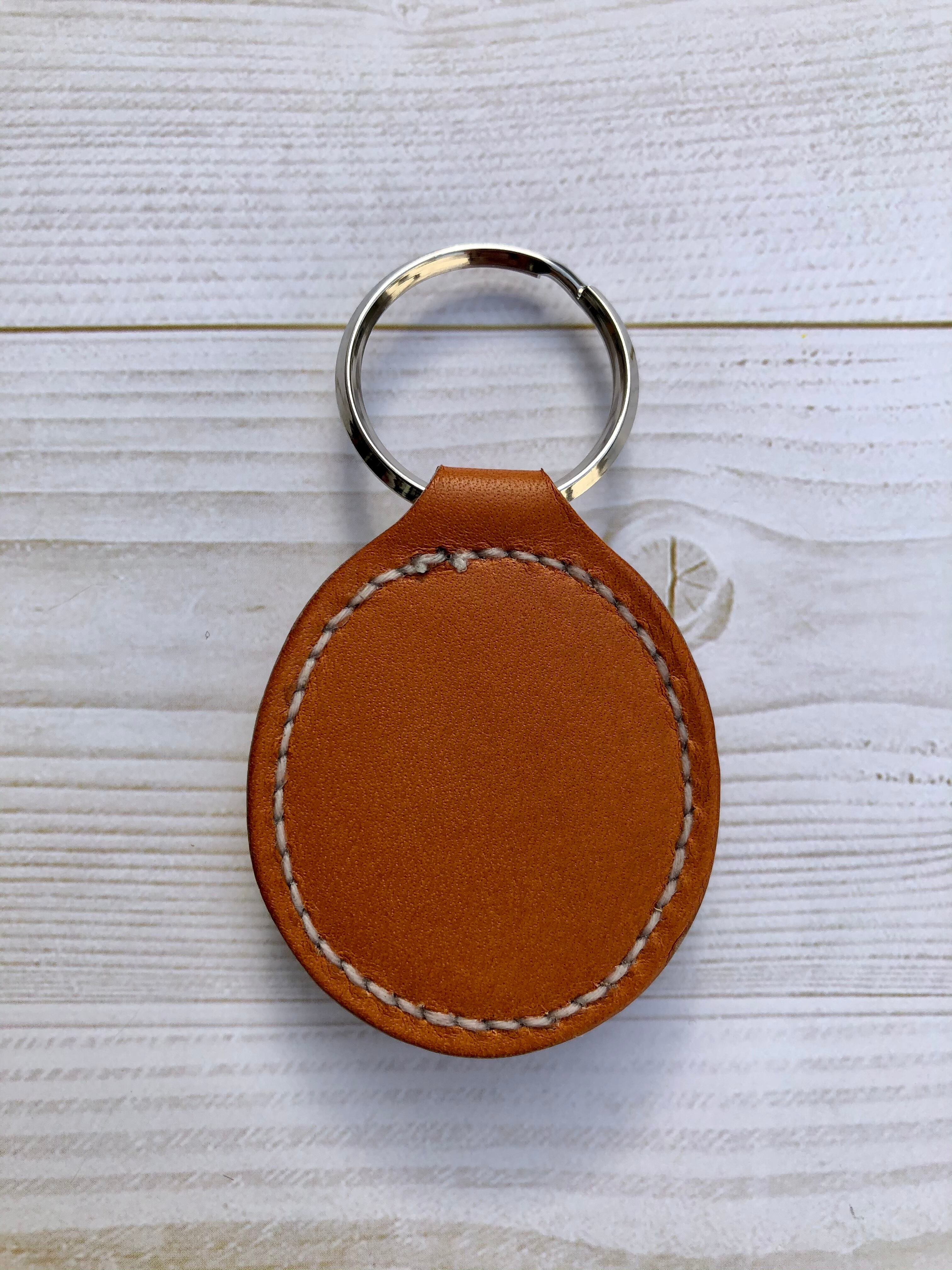 大きめのターコイズをワックスコードで包み、レザーに縫い付けて装飾したキーホルダーです。